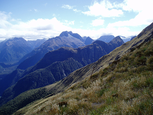 I decided I’d like to do the Milford Track but only had one day off coming up so I caught a bus out of Milford after work on Friday and hopped off about half way to Te Anau just over the mountains from the start of the Milford Track. I tramped up Dore Pass and made it just before dark. I went down off the tops and bivvied under my tent fly.