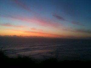 Then as so often happens I finally got a second wind. On reaching the end of the Te Henga track I knew I had to run the remaining 5.5kms, no stopping, if I was to break 14 hours. I managed it until just a hundred metres from the end when I just had to stop to take my only photo of the day – the beautiful sunset over the Tasman Sea.