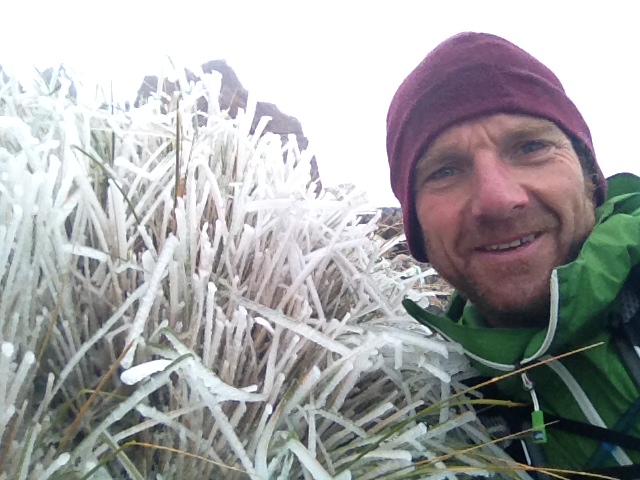 Then it was time for the finale – something big was in order to finish the week. But with dire warnings of an approaching weather bomb it needed careful planning. In the end I decided I had time to get up high early and make it back down to the relative safety of the valleys before the shit hit the fan. So I set off from St. Arnaud village retracing my steps around the edge of the lake before climbing up Robert Ridge into increasingly cooler temperatures. This is a staggering, albeit often rough, ridge run and on this day it was made extra challenging by the poor visibility and the thin veneer of icy snow that had appeared overnight. I stopped briefly to record an update of my Video Diary, just as the view disappeared for good as it turned out. Then it was onwards to Lake Angelus, over Mt. Cedric and down the quad-trashing, ankle-turning 1200m descent to Sabine Hut on the shores of Lake Rotoroa. Here I was grossly misinformed about the condition of the Speargrass track by a tramper. This 20km section of trail that was to get me most of the way back home was lovely in many ways but it was too steep and/or rough to run much of. Still, this type of training is very much about ‘Time on Feet’ and I certainly got a good dose of that. By 7.30pm when I hit the village I was pretty much done in, the stats for the day being: