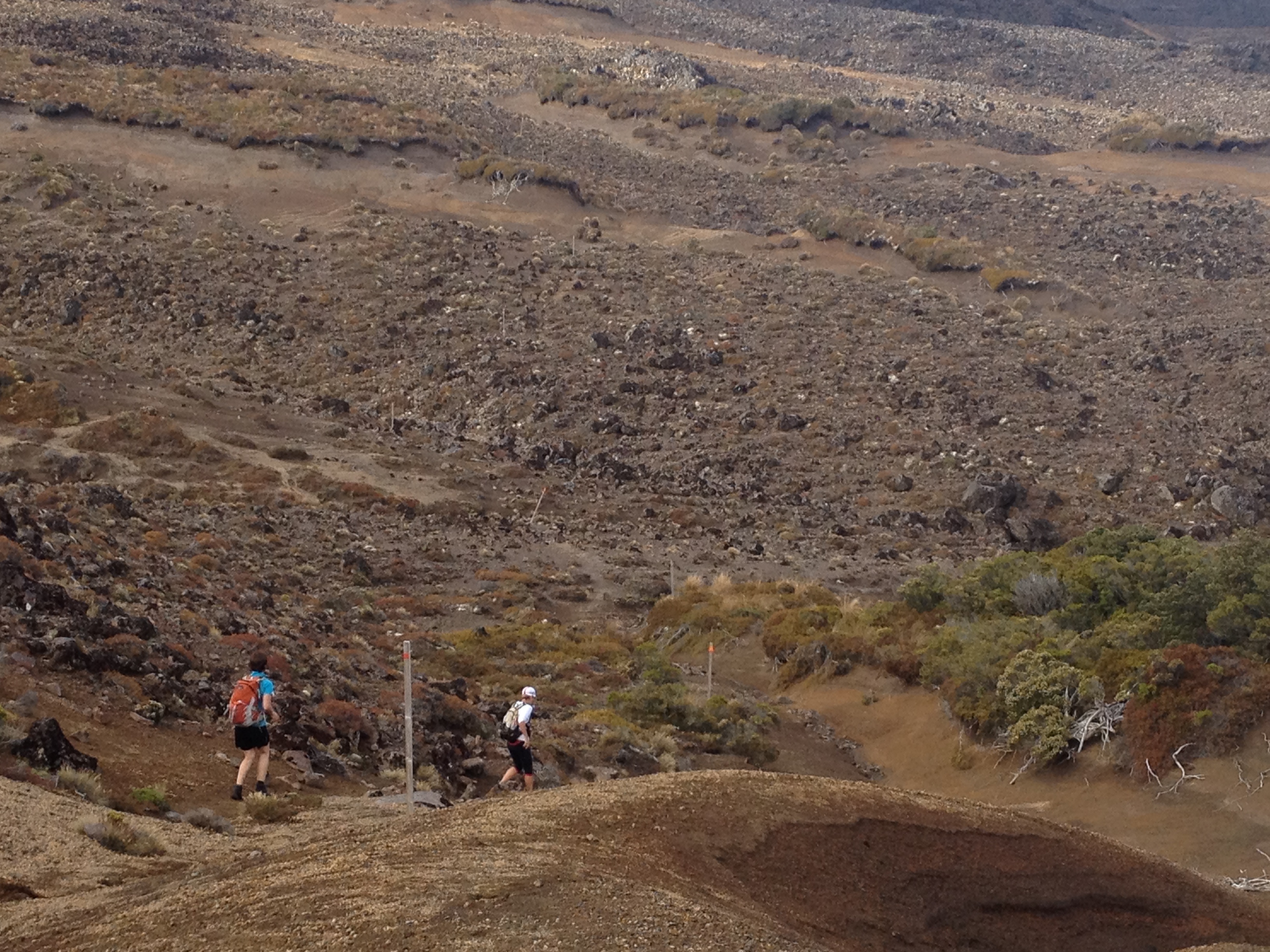 This is a pretty wild place to be at night. The ‘trail’ makes its way over bare rock and shattered lava and we’re finding our way by following the reflective strip on top of the snow poles. Picking the poles out in the dark is challenging and some have blown over. So we regularly stop and scan ahead, straining to pick up the next marker. But overhead the sky is a mass of stars. From time to time we turn out our lights and just stare in awe at the heavens. Running at night is so cool!