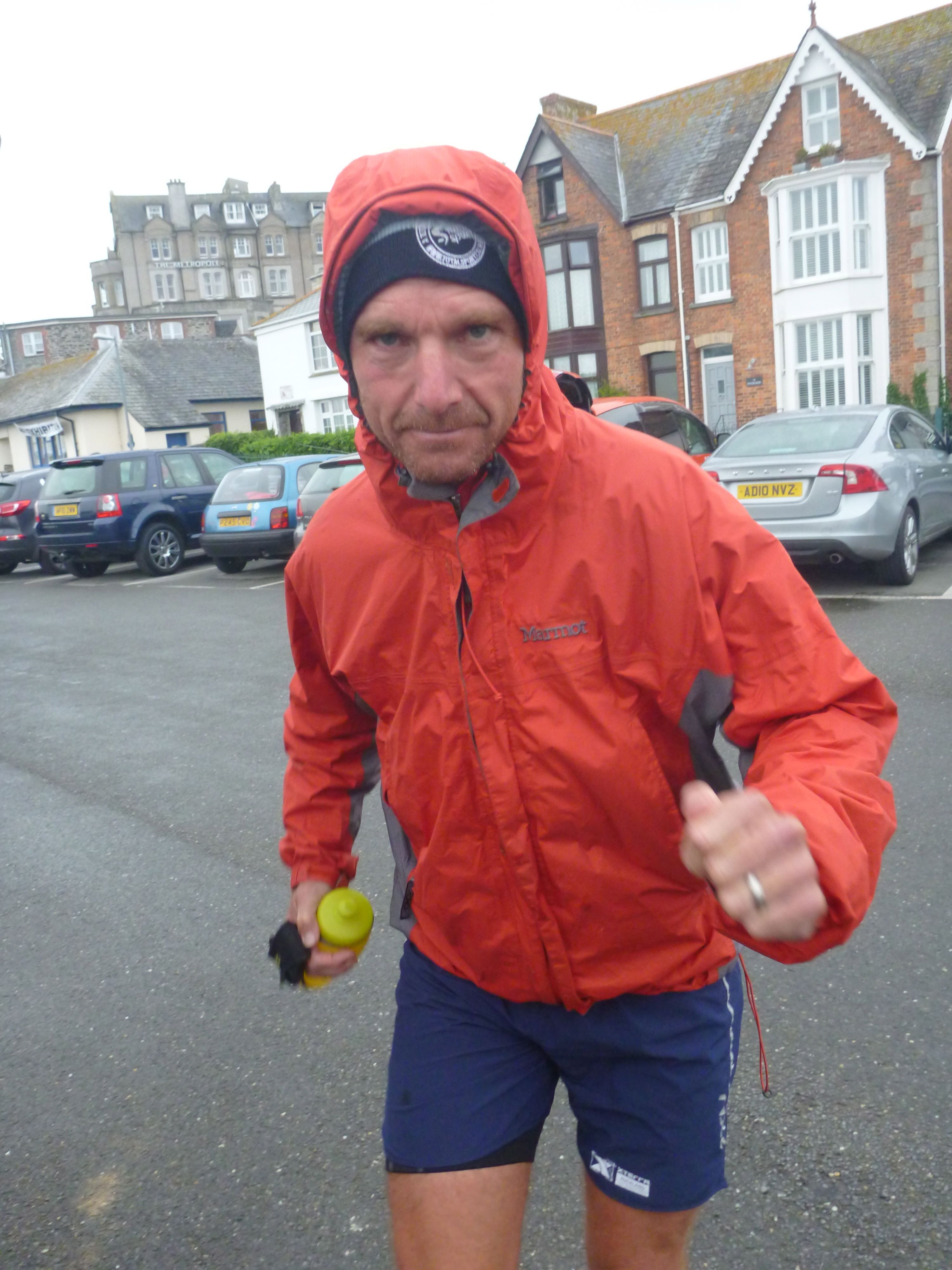 A long battle with soft sand and headwind got us to Perranporth, where we sat in the Spaceships with the heaters on, supping hot tea and trying to muster the will to get out there and take on the elements again. Phil wryly noted that this was Midsummer’s Day and he was no doubt wondering what the hell he was doing there when he could have been diving in warm waters off Malaysia instead. When eventually we got going we were rewarded with another lovely section of awesome cliff top running in slightly easing conditions. By the time we reached Porthowan the rain had pretty much stopped but we were well and truly done. We’d been on our feet for 11 hrs and made 64 kms of progress. A good result in trying conditions but despite that we’d slipped another few kms behind the original schedule.