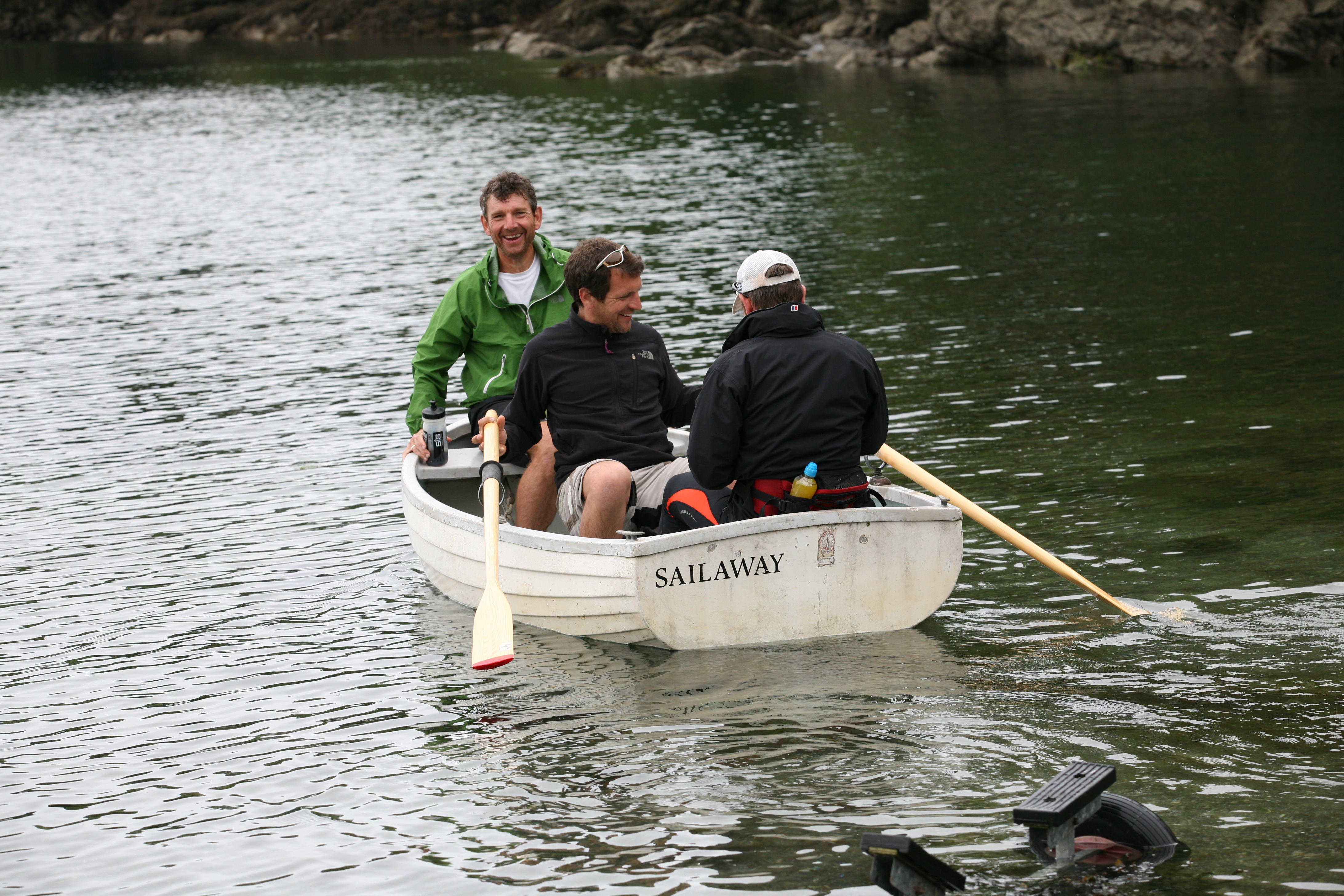 Around midday we came to Gillan Harbour where the Coast Path takes a low tide route straight across the inlet. But the tide was high – it would be wouldn’t it! However, just when we thought we’d have to add in a few extra kilometres detour inland, Mike revealed his cunning plan. He’d borrowed a dinghy from a local and would row us across to the other side. This lifted our spirits immensely and provided for a welcome diversion from the never-ending game of putting one foot in front of another, albeit for just 10 mins.