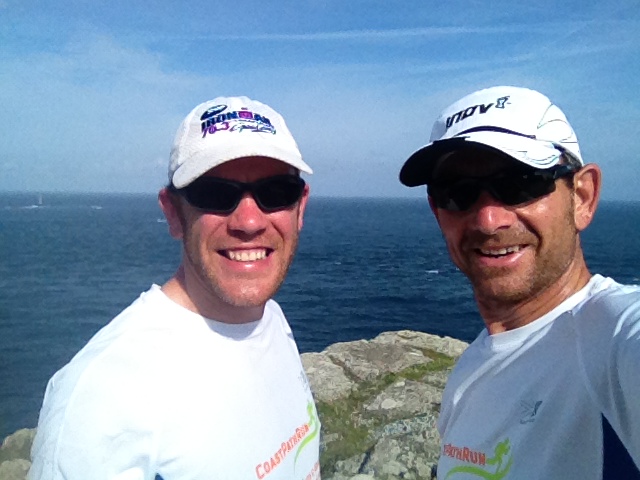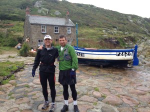 From the start it was clear that Tom’s knees were giving him a lot of pain, but we were both hoping this might ease off as he got warmed up. We ran around a lovely headland into Sennon Cove, all the while looking across the waves to the great psychological prize that was Land’s End. There we met the support crew for what should have been just a brief refueling stop but Tom was slow to get going again. Things were clearly not right and the pain was etched on his face when we finally reached the lighthouse. We stopped here for the obligatory photo, but despite the sunshine and the significance of the location, the mood was somber.