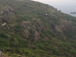 We carried on along the spectacular cliff tops but the pace was slow and Tom was feeling his way cautiously down all the descents. Somewhere along here he made the first mutterings about not being able to continue. He was distraught and I was feeling devastated for him. I really did think the next support stop would be his last, but with a rev up from brother Mike and a stack of gutsy will power he left Porthgwarra and we continued heading west with the wind at our backs (at last!)