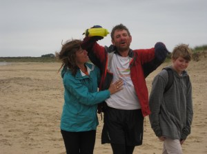 Soon enough we crested what I realised was the last hill. Ahead was flat along the cliff tops, then downhill to the beach, then flat along the sands to the finish. The finish! I could barely believe it! Like an over-excited school child on the last day of term I started finding new energy from nowhere and was once again running (well, kind of anyway). I ran most of the final 5kms or so and we found ourselves within sight of the finish way ahead of the time we’d told everyone we’d be there. I could make out a small huddle of people in the distance but wasn’t sure if this was Sal & co or not, so I sent Paulo on ahead to check them out. I did not want to reach the end and find I’d beaten the reception committee there!